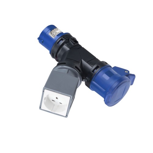 | 15002E | Adaptador clavija industrial 2P+T / 1 base industrial 2P+T + 1 base schuko UK IP20 SpeedPRO |