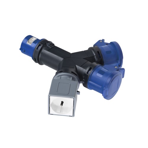 16010F | Adaptador clavija industrial 2P+T / 2 bases industrial 2P+T + 1 base schuko sistema francés IP20