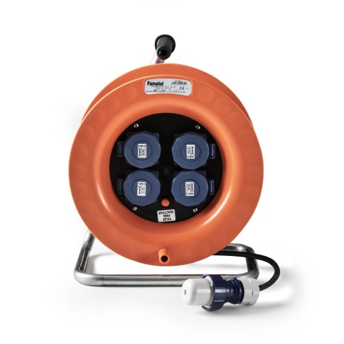 Enrollacable 50m H07RN-F 3G1,5mm2; entrada: clavija schuko 2P+TTL 16A / salida: 4 bases schuko 2P+TTL 16A IP55. Fabricada con materiales de alta calidad, esta clavija asegura conexiones robustas y duraderas. Diseñada para cumplir con los más altos estándares de seguridad y eficiencia. Enrollacable 50m H07RN-F 3G1,5mm2