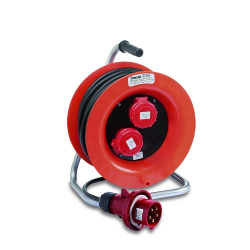 Enrollacable 25m H07RN-F 5G2,5mm2; entrada: clavija industrial 3P+N+T 16A / salida: 2 bases industriales 3P+N+T 16A IP55. Fabricada con materiales de alta calidad, esta clavija asegura conexiones robustas y duraderas. Diseñada para cumplir con los más altos estándares de seguridad y eficiencia. Enrollacable 25m H07RN-F 5G2,5mm2