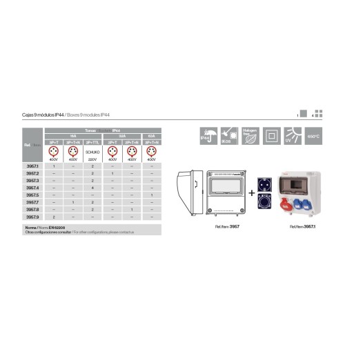 | 3957.9 | Envolvente cableada 9 módulos con 2 tomas 3P+T 16A 400V IP54 AcquaCOMBI | 8429760229551 |