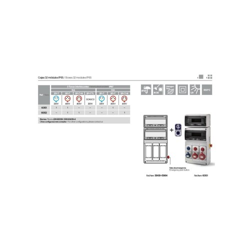 | 6052 | Envolvente cableada 32 módulos con 1 toma interblocante vertical 3P+T 16A + 1 interblocante vertical 3P+N+T 16A + 1 interblocante vertical 3P+N+T 32A IP65 | 8429760240273 |