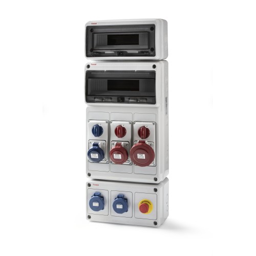 6054 | Envolvente cableada 32 módulos con 1 toma interblocante vertical 2P+T 16A + 1 toma interblocante vertical 3P+T 16A + 1 toma interblocante vertical 3P+N+T 32A + 2 tomas schuko IP65
