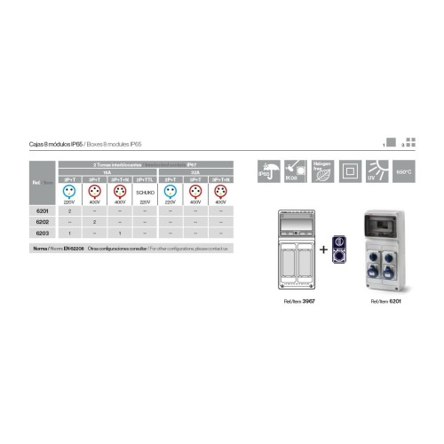 | 6202 | Envolvente cableada 8 módulos con 2 tomas interblocantes verticales 3P+T 16A 220V IP65 AcquaCOMBI | 8429760219637 |