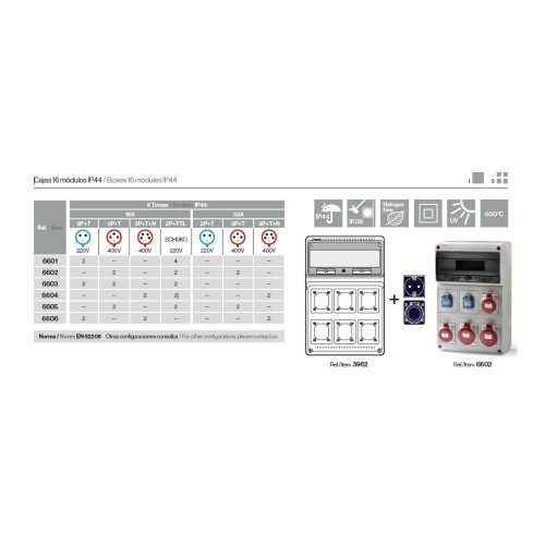 | 6605 | Envolvente cableada 16 módulos con 2 tomas 3P+T 16A 400V + 2 tomas schuko + 2 tomas 3P+T 32A 400V IP54 AcquaCOMBI | 8429760212485 |