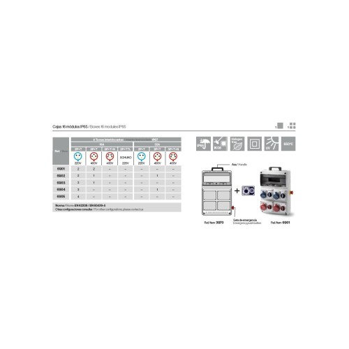 | 6902 | Envolvente cableada 16 módulos con 2 tomas interblocantes horizontales 2P+T 16A +1 interblocante horizontal 3P+T 16A +1 interblocante horizontal 3P+T 32A IP66 | 8429760218982 |
