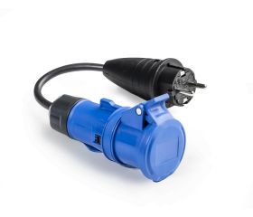 Adaptador clavija schuko 16A / toma industrial 2P+T 16A con prolongador 25cm cable H05VV-F 3G1,5mm2 IP54 SpeedPRO. Ofrece conexiones seguras y duraderas.