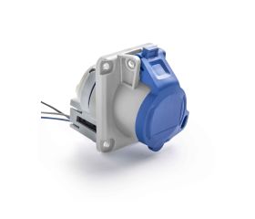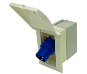 Clavija empotrable basculante para caravana 3P 16A color blanco IP44. Ofrece conexiones seguras y duraderas.