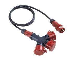 Adaptador 1 clavija / 3 bases 3P+N+T 32A 400V con prolongador de 2 m. de cable flexible IP54 SpeedPRO. Ofrece conexiones seguras y duraderas.