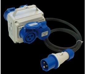 Adaptador 1 clavija / 3 bases 3P+N+T 32A 500V con prolongador de 2 m. de cable flexible IP54 SpeedPRO. Ofrece conexiones seguras y duraderas.