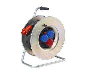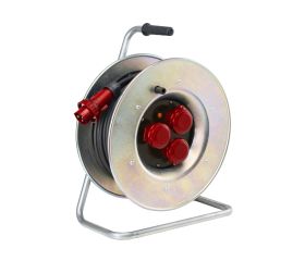 Enrollacable metálico 50m H07RN-F 3G2,5mm2; entrada: clavija industrial 2P+T 16A / salida: 3 bases industriales 2P+T 16A IP55. Ofrece conexiones seguras y duraderas.