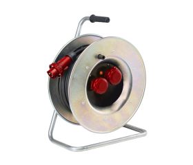 Enrollacable metálico 50m H07RN-F 5G2,5mm2; entrada: clavija industrial 3P+N+T 16A / salida: 2 bases schuko 2P+TTL 16A + 1 base industrial 3P+N+T 16A IP55. Ofrece conexiones seguras y duraderas.