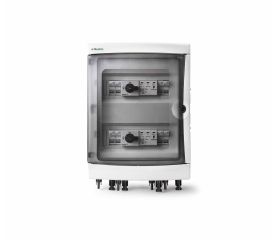 Cuadro DC-SE 2 string(s) / 1 MPPT, seccionador 63A, intensidad nominal 16A por string, con conectores MC4. Protección con fusibles, seccionador y sobretensiones. Envolvente de 12 módulos DIN.