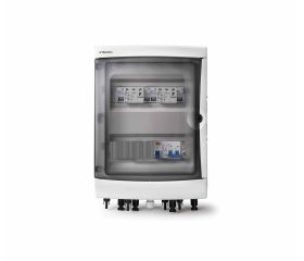 Cuadro combinado DC-AC 2 strings / 2 MPPT, AC 1P+N 32A. Protección DC con fusibles, seccionador y sobretensiones + protección AC con IGA, diferencial y sobretensiones. Envolvente de 42 módulos DIN.