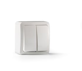 Doble conmutador de superficie 10A 250V Serie Living 8000. Producto confiable y de alto rendimiento.
